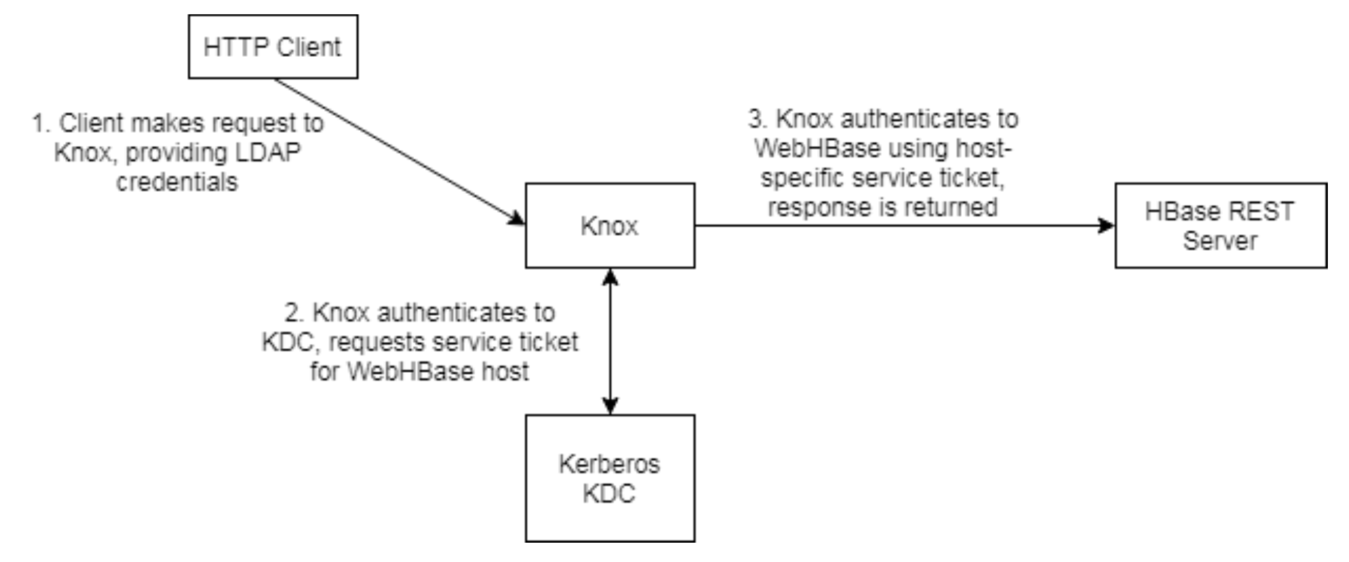 - Client submits call to Knox, targeting WebHBase endpoint (e.g. https://knox.gateway.host:8443/gateway/default/hbase/version), providing basic auth credentials.